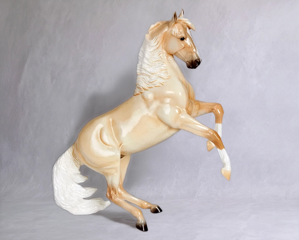 Dapple Palomino Pinto Desatado (mold #721) with roaning | dappled palomino pinto, wide blaze, white mane/tail, fore socks, hind stockings | 2014 | BreyerFest Live Auction (1 made) |