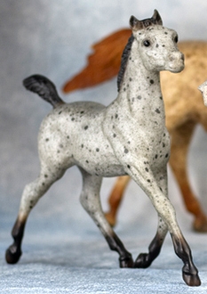 133 | Running Foal Spice | glossy dapple grey, bald face, grey mane/tail, four stockings | 1961/1963-1973 | Many have blanket appaloosa pattern, some with dapples to the withers, some with dapples to the neck |