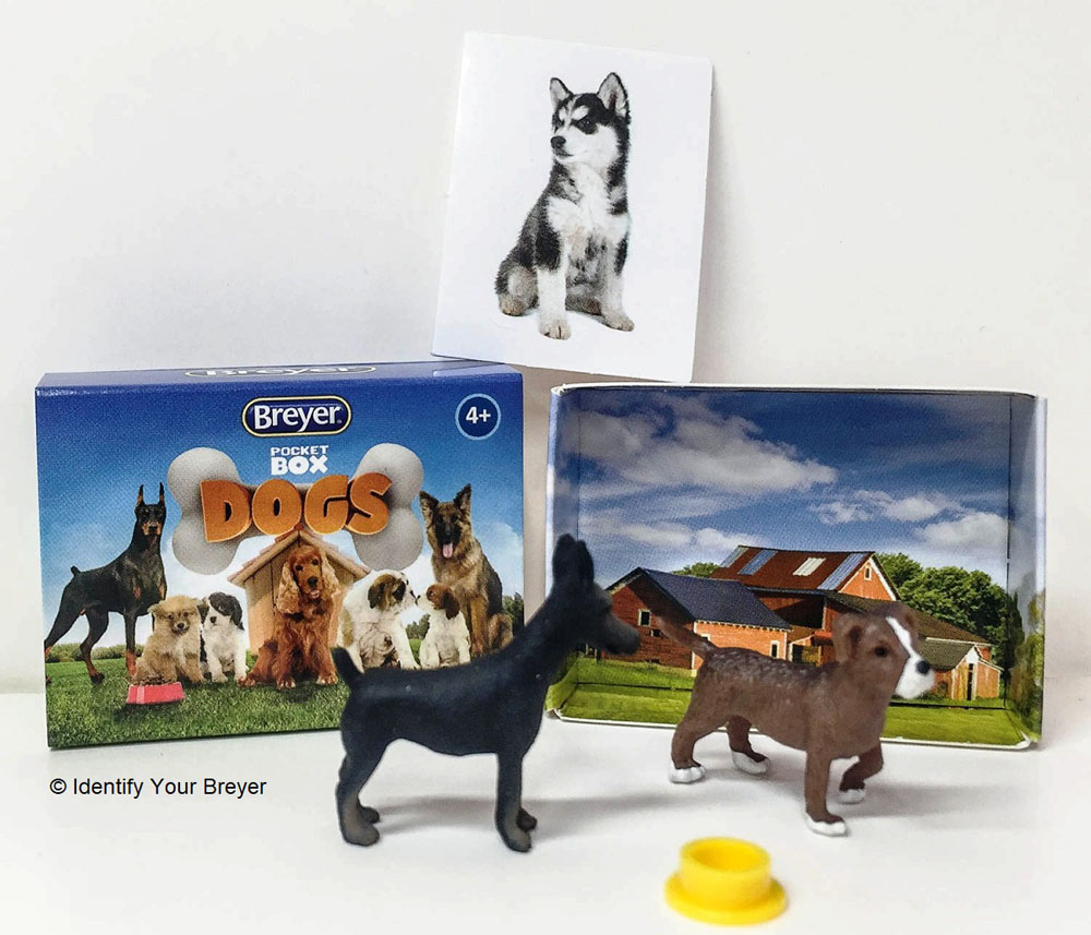 In 2016 Breyer introduced the Pocket Box Dogs blind bags and followed with the Pocket Box Animals and Pocket Box Aquarium in 2017. Each bag consists of two small animals, one or two stickers and a small cardboard box "home." As with all blind bags you can't see which animal you are going to receive until you open the package. These micro minis are approximately 1.25" long x .75" high and each box sells for roughly two dollars U.S.