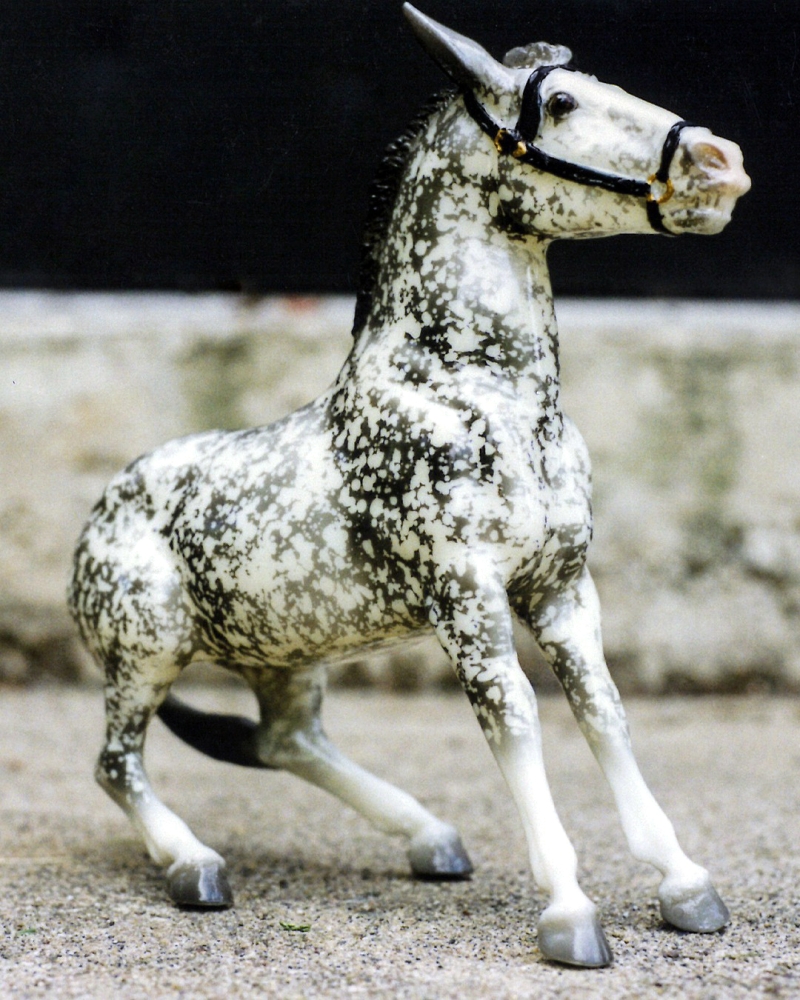 753 | Molly | glossy grey barrel blanket, extensive black spots, black mane, grey and black tail, black lower legs, black halter | Jan-Jun 1999 |