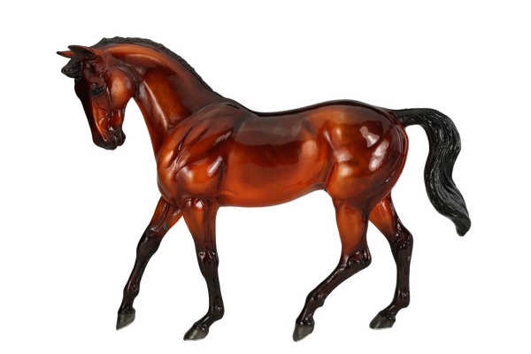 red chestnut to medium dark brown, star with connected stripe, lighter chestnut mane/tail, black or bi-color eyes, two hind stockings | 1996-2004 | Models in 1996/early 1997 have bi-colored eyes. Showing 1990's version. | ||