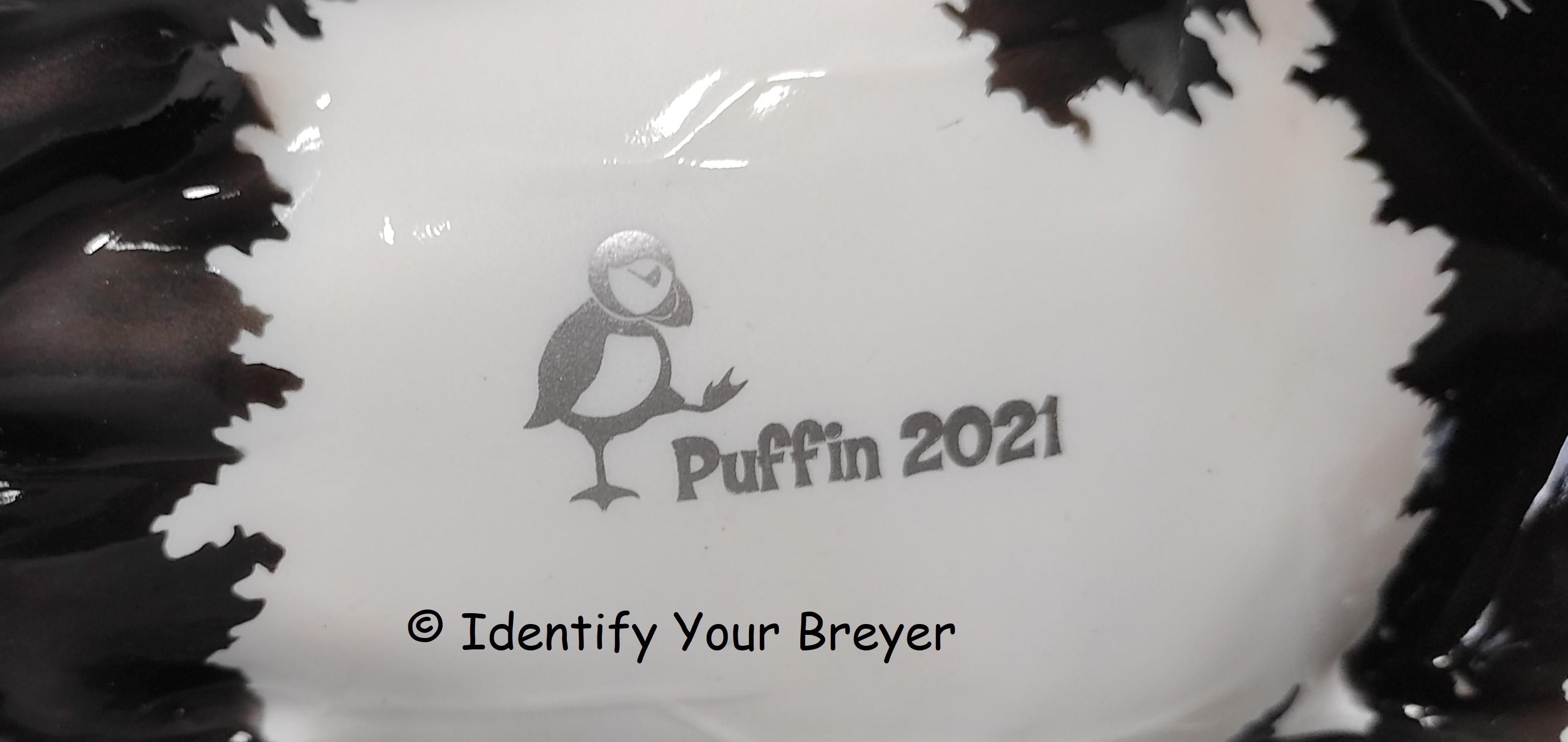 712383 | Puffin | glossy black sabino, red tail ribbon | 2021 | Birds of a Feather (380 made) "Puffin 2021" stamped on belly. |