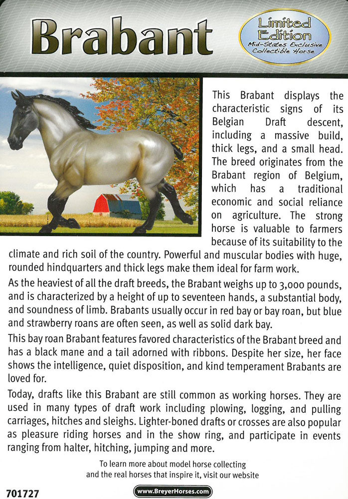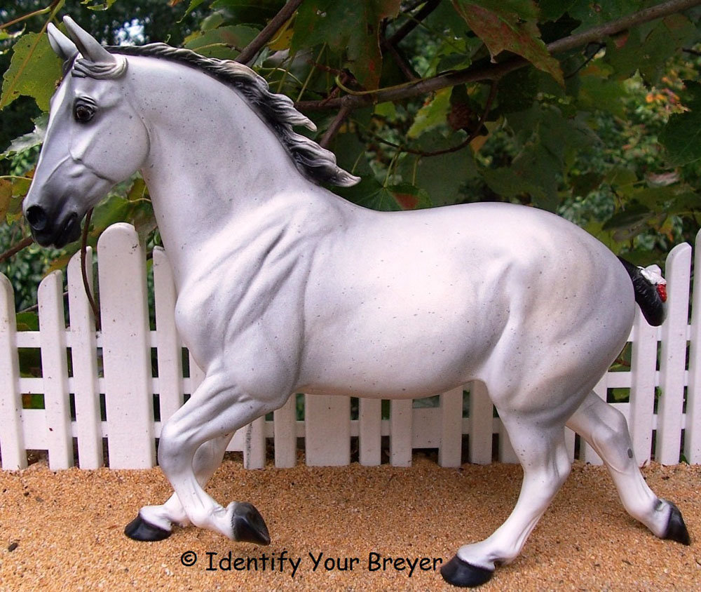 The Wixom mold was introduced in 2001 and is a portrait model of champion Percheron mare Cedarfarm Wixom, owned by John and Gerry Leekley. It was sculpted by Donna Chaney and is Breyer mold #573.