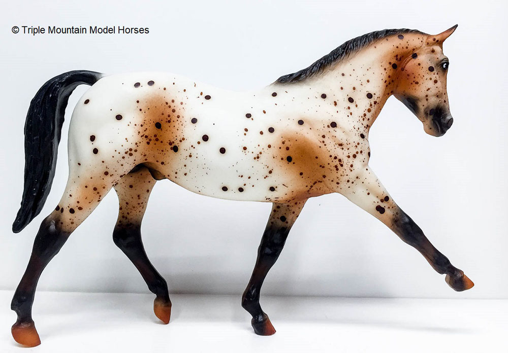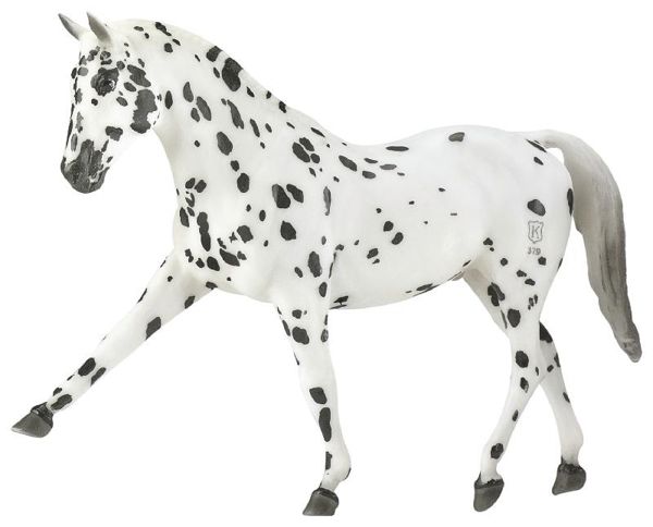 1352G | Glossy Sheik af Hallundbaek | glossy black leopard, white body with black splatter spots, black and white mane, shaded grey tail | 2009 | BreyerWest Live Show Prize Model (16 made) |