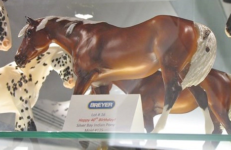 | 1231 | Glossy Savanna Dial | glossy brown tobiano, blaze down over muzzle, dark chestnut mane, grey and white tail, two feathers each in mane, tail | 2004 | BreyerFest Live Show Prize (10 made) |