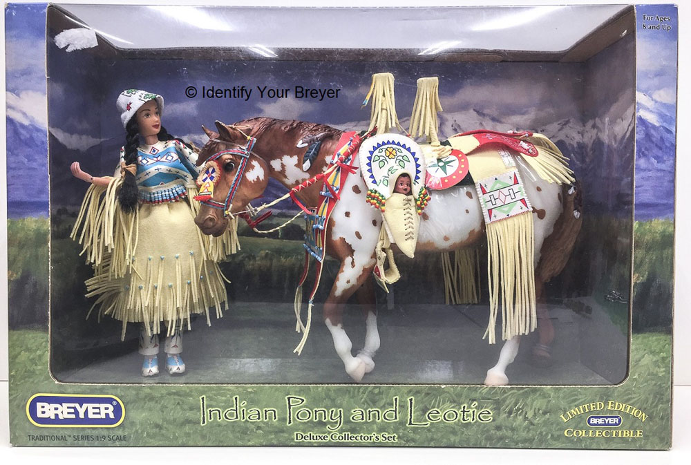 1284 | Indian Pony and Leotie Gift Set With doll, Leotie, wearing a replica of Native American buckskin dress and with leather tack. |