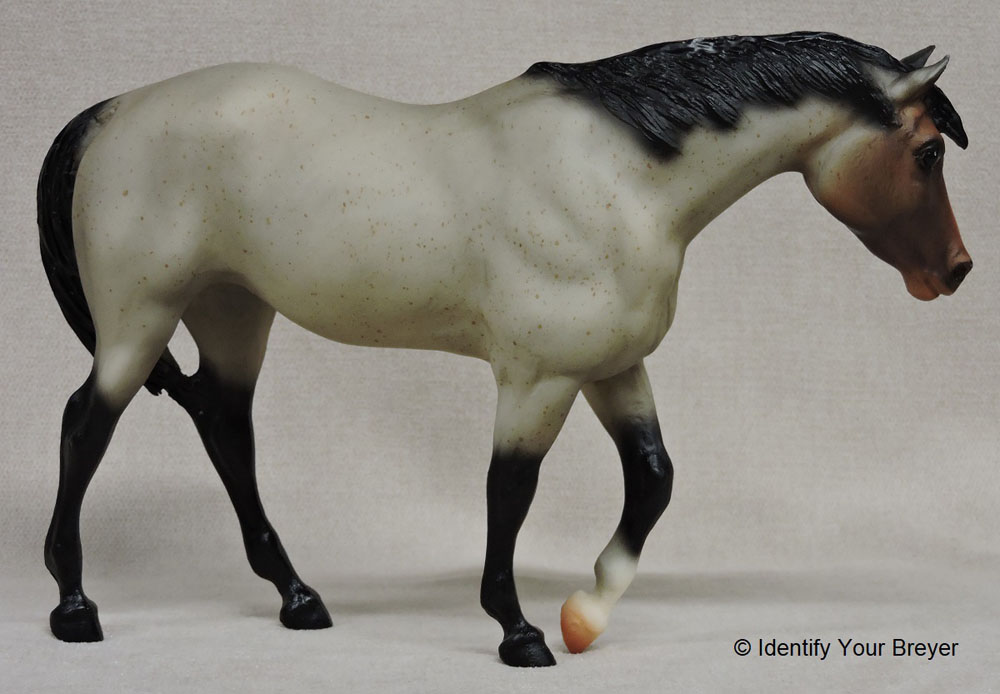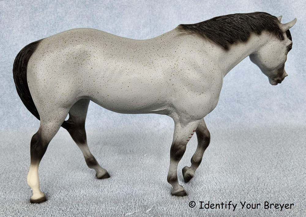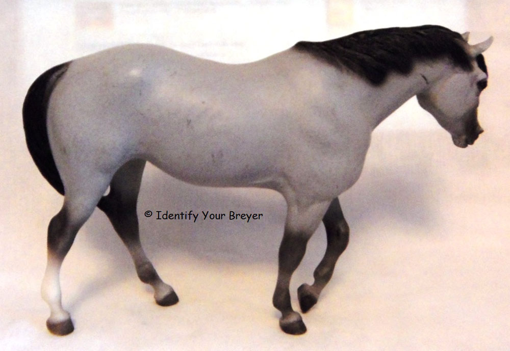 701903 | N'iekeni | grullo tobiano, darker/black points, dark face, shaded body, four stockings, two feathers in mane, tail | 2003 | Mid-States Distributing (3,000 made) |