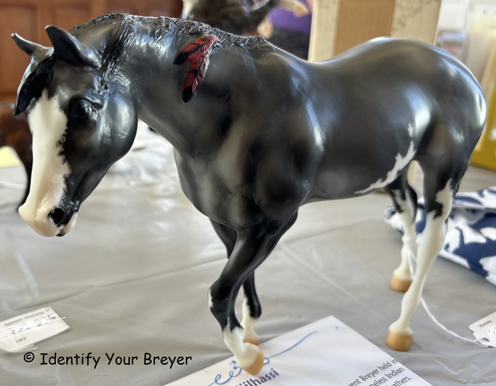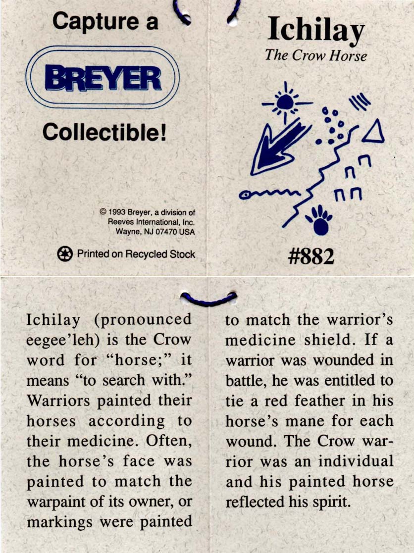 882 | Ichilay the Crow Horse - Feather | light grey with brown flecks, solid face, charcoal-brown mane/tail, grey shading, off hind stocking, 3-color feather | 1993 | With hang tag. Tag is the same for all four variations. | |