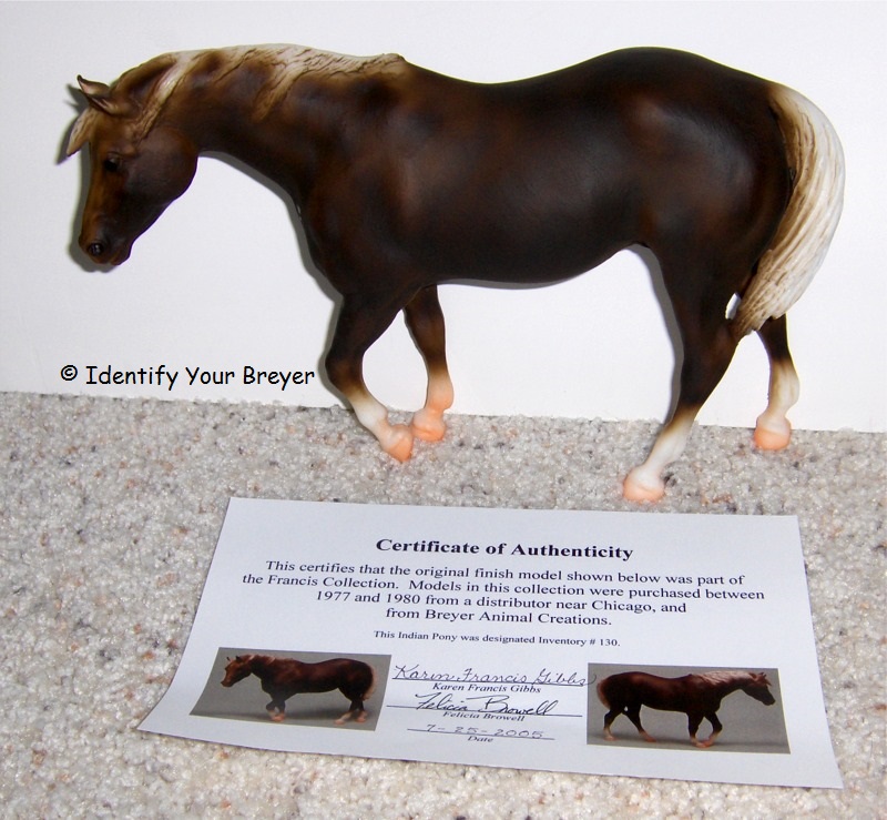 Indian Pony | shaded brown bay, black points, bald face, two airbrushed socks, (left front, right hind) | Between 1977-1980 |