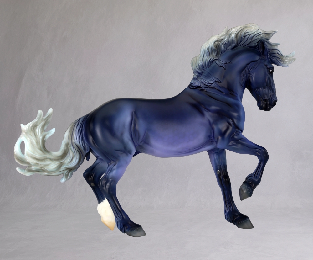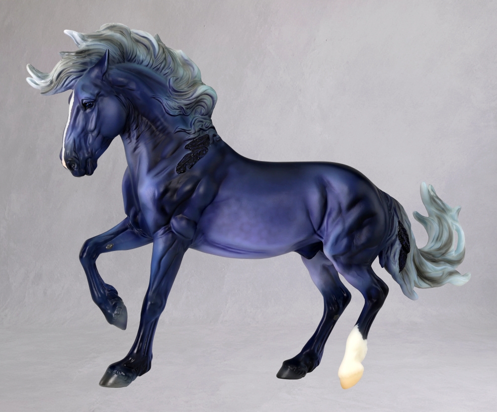 B-EV-10768 | The Wanderer | purple/blue, sock on left rear leg, blue left eye, white right eye, raven feathers added to left mane/tail | 2026 | BreyerFest Special Run (2,400 made) "BreyerFest 2026" stamped on belly |