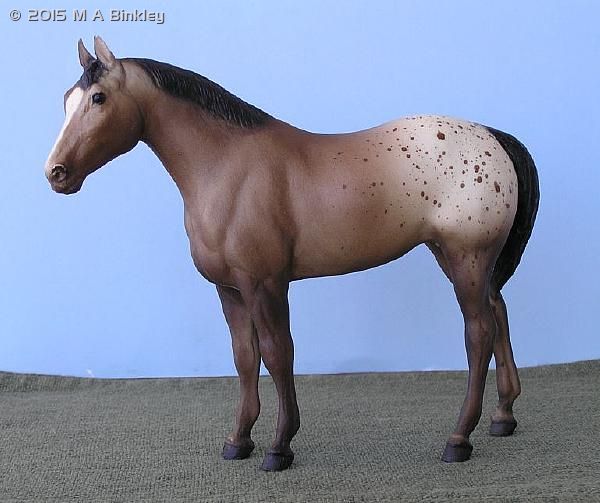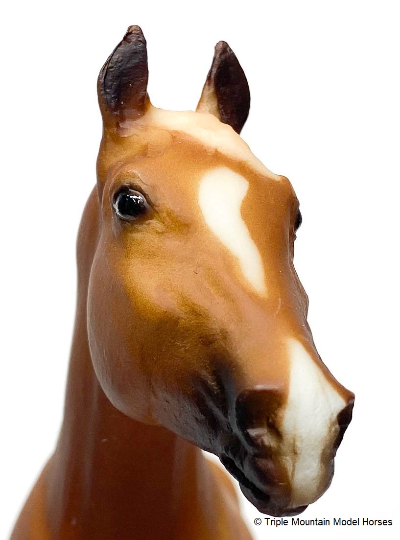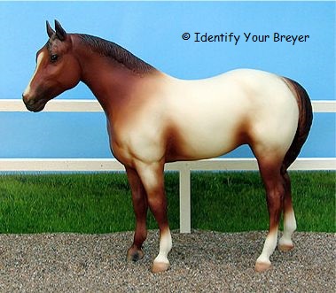103 Quarter Horse Yearling matte and semigloss sandy bay blanket, blaze, black mane/tail, most with solid bay legs 1971-1988 Color varies from light sandy bay to a darker brown bay. Variations include two and four stockings, black spots instead of brown, or extended blanket.