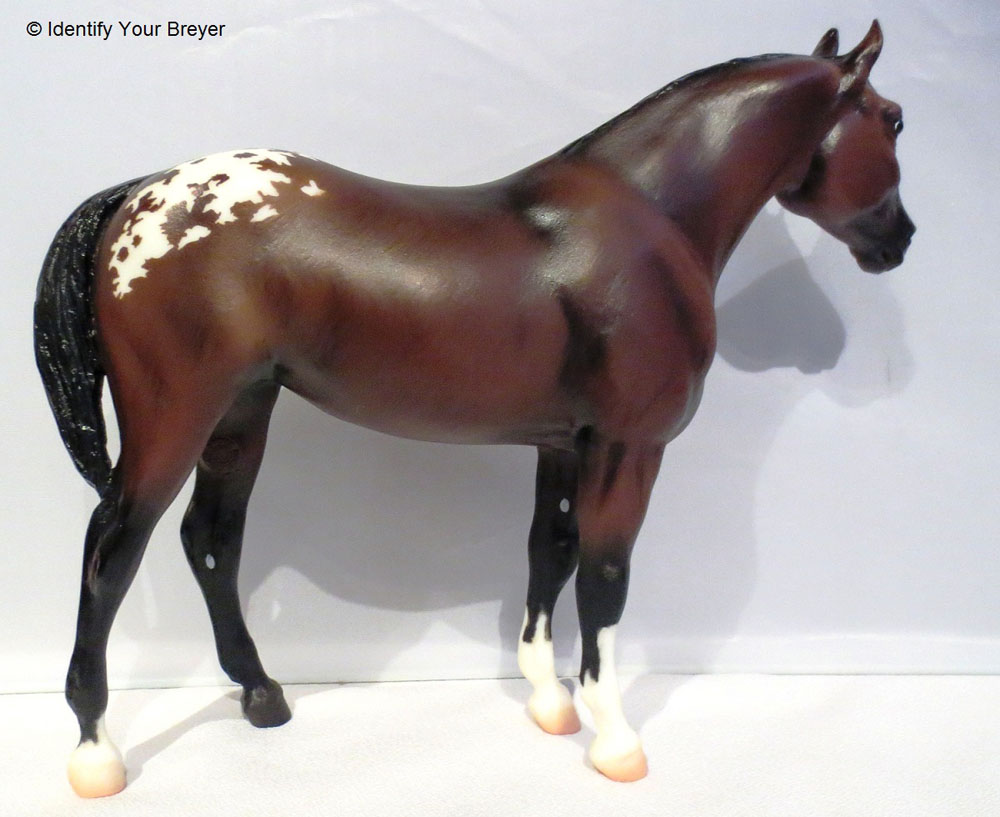 chestnut semi-leopard, blaze, dark chestnut mane/tail, reddish chestnut legs, near fore stocking, hind socks, no spots Jan-Jun 1996 Collectors' Edition variation, likely small run