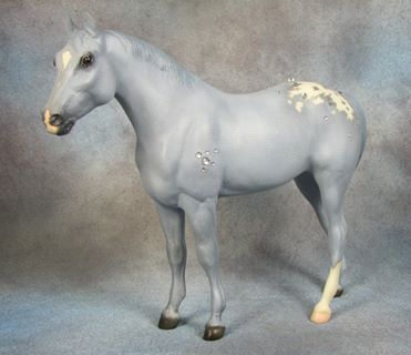 (c) Reeves International, Inc. "Appaloosa Twill" - Blue denim QH Yearling (mold #20) with diamond bling spots. blue, snowflake blanket and "diamond" chips, star, pink snip, mane/tail same color as body, near hind sock 2013 BreyerFest Live Auction