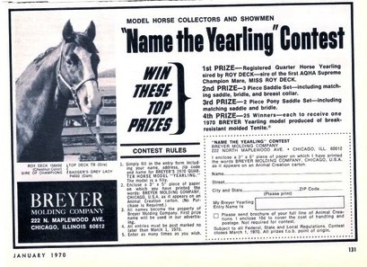 The earliest Quarter Horse Yearling models have only the round "Breyer Molding Co." mold stamp. In 1971 or 1972 the "U.S.A." mold stamp was added, and some of these also have the "B" stamp. The Quarter Horse Yearling was sculpted by Chris Hess and is Breyer mold #101.