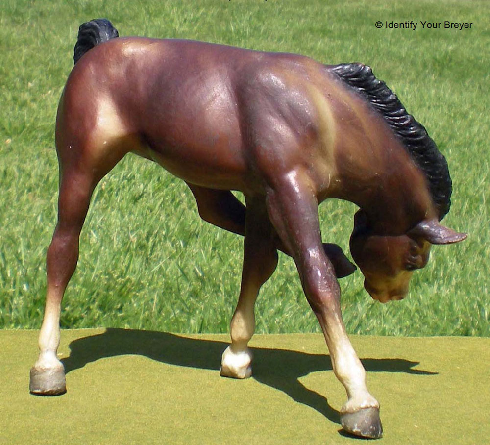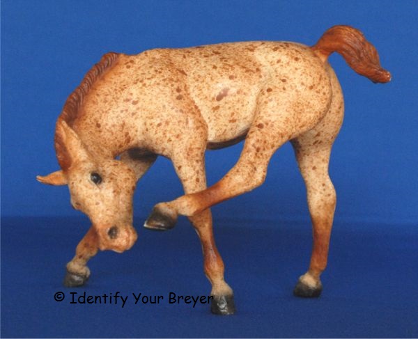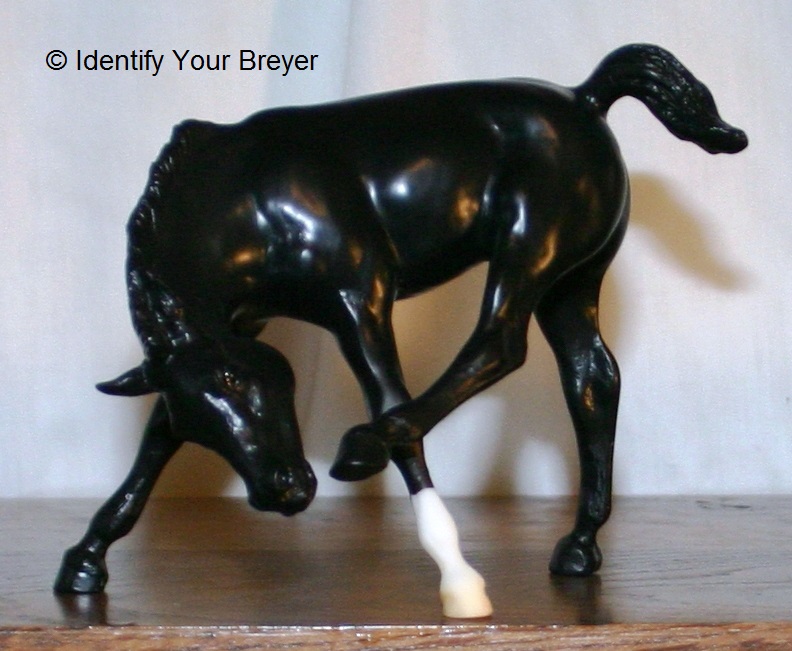 The Scratching Foal was introduced in 1970 with the round "Breyer Molding Co." mold stamp. In 1970 or 1971 the "U.S.A." stamp was added, and some of these may have the "B" stamp as well. The mold was sculpted by Chris Hess and is Breyer mold #168.