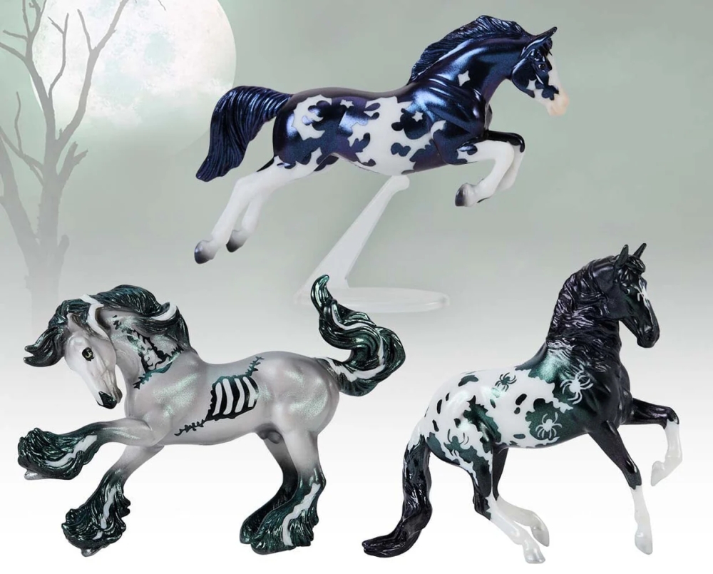 B-CS-10477 | Spooky Surprise! - Mini Tabitha | Dark blue interference with hidden witch images in pinto pattern, 4 stockings. | 2025-current | Three models sold individually in blind bags: Warmblood Jumper "Tabitha", Vanner Stallion "Thriller", and Alborozo "Eek". |