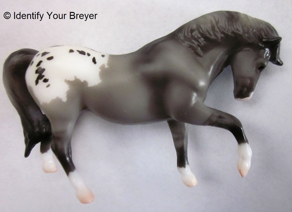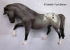 The Quarter Horse Mare is a G1 mold and originally had no mold marks, but shortly thereafter received the linear "Breyer Molding Co. � 1976" stamp. A few years after this the "Mexico" stamp was added, which can be seen with or without the "B" stamp. After the purchase of Breyer by Reeves International the original "Breyer" mold stamp was replaced by "Reeves International, Inc." The mold was referred to as "Head Down Horse" by Hagen-Renaker and changed to "Quarter Horse Mare" when introduced by Breyer, at which time it was also changed from a stallion to a mare. The mold was originally sculpted by Maureen Love for Hagen Renaker and is Breyer mold #5045. Breyer's agreement with H-R for the use of their molds ended in 2009, but the release of Primrose in 2016 suggests that Breyer and Hagen-Renaker may have reached a new agreement for the use of this and other Love molds.