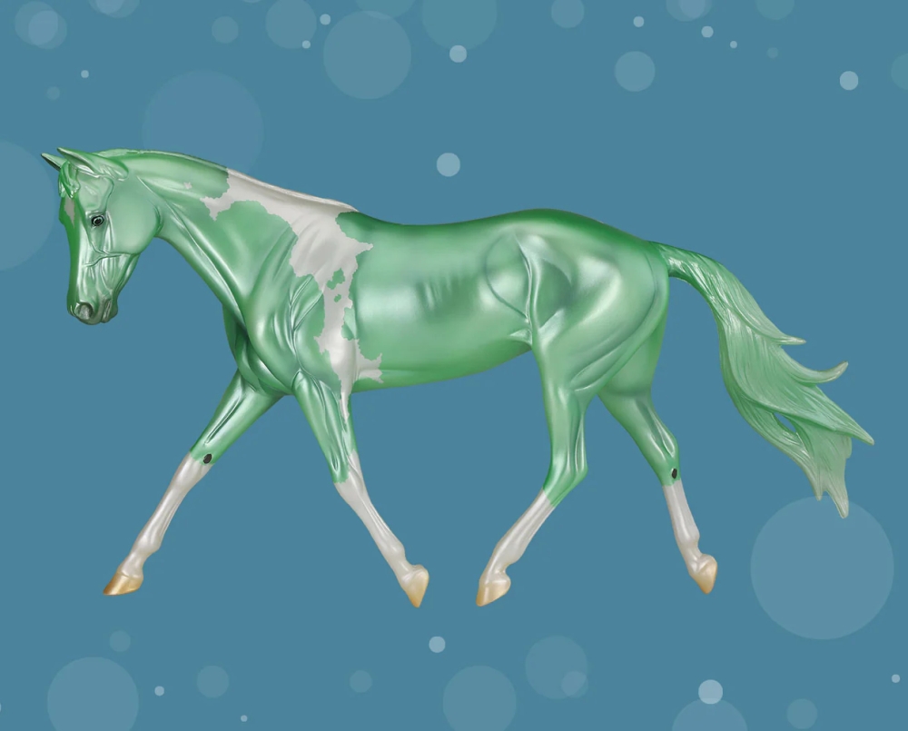 B-CS-10528 | Merry Dancer - Green | pearly green with blue interference pinto, star, 4 stockings | 2025 | Christmas Horse 1000 made "Mery Dancer 2025" stamp on belly |