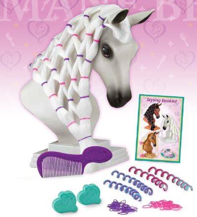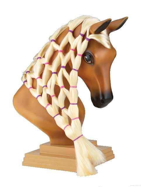 With rider, 3 ribbons, judge's stand, lunge caveson, surcingle, 2 side reins, lunge line, trophy, mini riding lesson book.