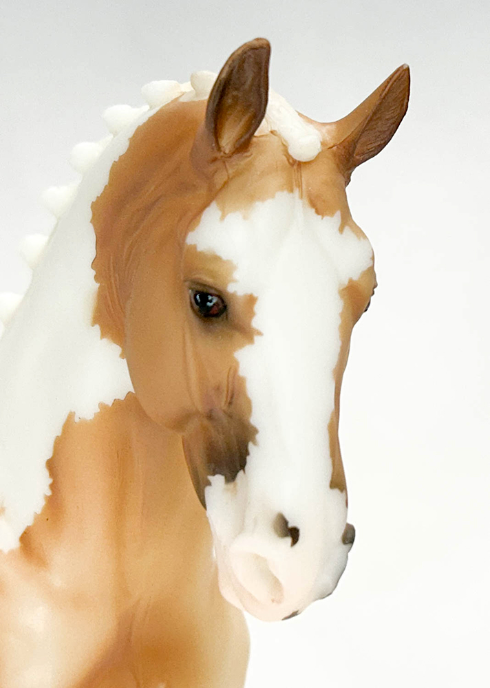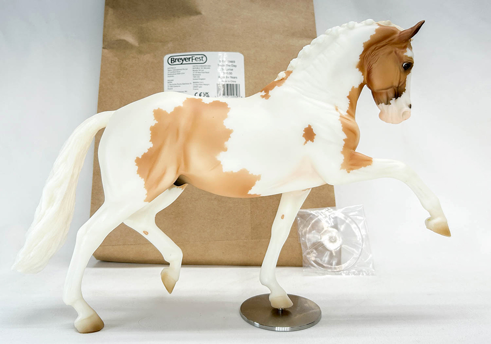 B-EV-10469 | Seize The Day Surprise | Glossy palomino tovero, apron blaze. | 2025 | BreyerFest Special Run (384 made) Split run of 6 color variations. Deco is glossy only, Blue Roan is matte only, other 4 colors glossy & matte versions. “BreyerFest 2025” stamp on belly. |