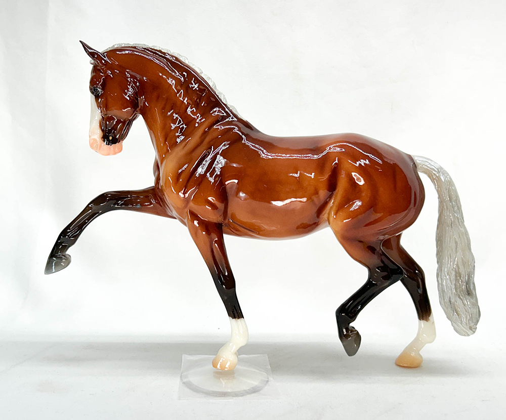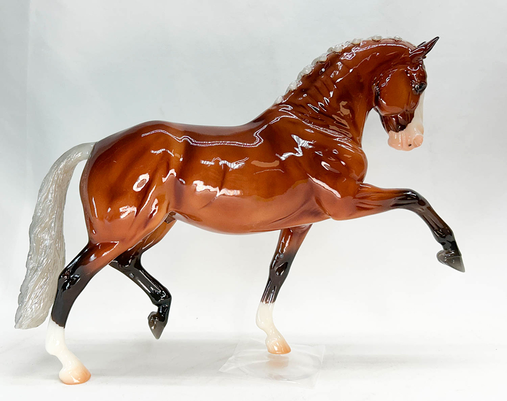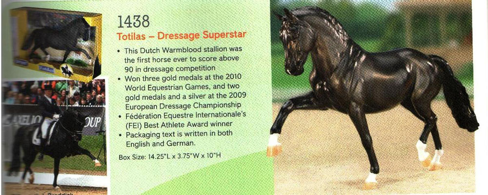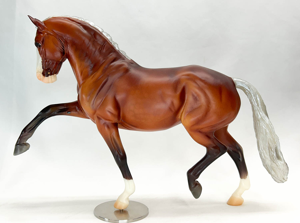 The Totilas mold was introduced in 2013 and is a portrait model of Dutch Warmblood dressage superstar Totilas. The mold was sculpted by Brigitte Eberl and is Breyer mold #725.